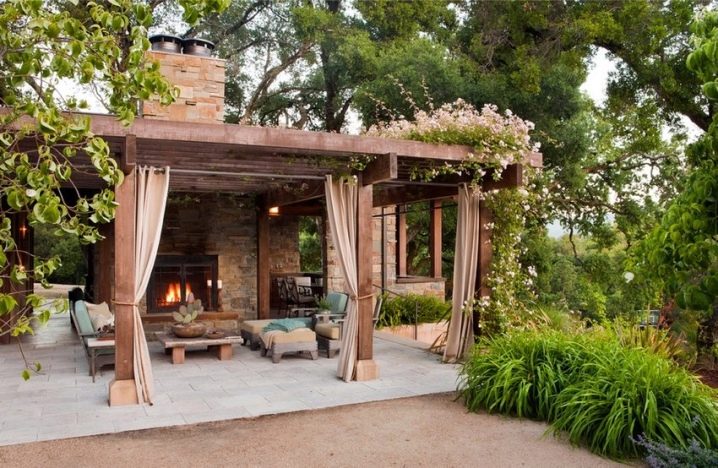 ستكون شرفة المراقبة شبه المفتوحة مع مدفأة مكانًا رائعًا لقضاء أمسية صيفية. يتيح لك الجمع بين الخشب والطوب الحفاظ على التوازن بين الخفة والصلابة. يتم حل مشكلة الحماية من الرياح الباردة بمساعدة الستائر. تتيح لك الإضافة في شكل نباتات التسلق الشعور بالعزلة عن العالم الخارجي داخل شرفة المراقبة ، وهو أمر مهم إذا كنت ترغب في الاستمتاع بقضاء عطلة مريحة.