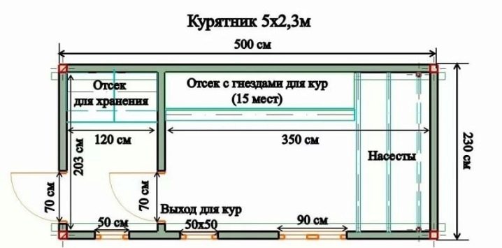 يظهر هذا الرسم مخطط نسخة الميزانية من حظيرة الدجاج لفصل الشتاء بأبعاد 5×2.3 م. توجد أماكن لتخزين الأعلاف ومساحة دائمة لـ15 طائر. هناك أيضا المجاثم. يبلغ حجم المخارج 0.5×0.5 متر ، ويبلغ عرض الأبواب الأكبر 0.7 متر..
