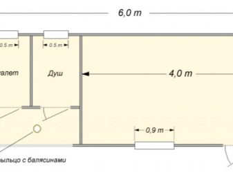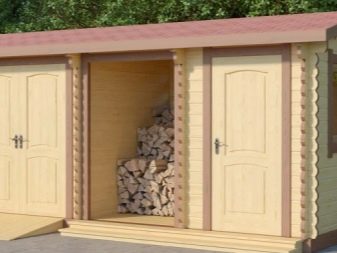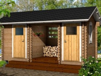 الخيار التالي مصنوع في شكل منزل تغيير وشرفة ومكان مفتوح لتخزين الحطب.. يجمع خيار آخر تحت سقف واحد ، بالإضافة إلى غرفة الحطب والمرافق ، العديد من الأقسام المفيدة. غالبًا ما تكون مصنوعة من دش ومرحاض. ومع ذلك ، في هذه الحالة ، سيكون من الضروري تجهيز حوض رأس المال ، ويفضل أن يكون مختومًا.