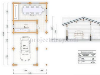 يشغل المبنى 10.5×5.6 متر مربع. م من المساحة الإجمالية ومناسبة لقطعة أرض كبيرة. مظلة بقياس 5.5×4 قدم مربع. م لسيارة واحدة وشرفة – 3×5.6 متر مربع. م تقع على جوانب مختلفة من كتلة المرافق (2×4 متر مربع). يتيح لك المدخل الجانبي للمبنى الخارجي الدخول إليه بسرعة من جانب شرفة المراقبة ومن منطقة وقوف السيارات.