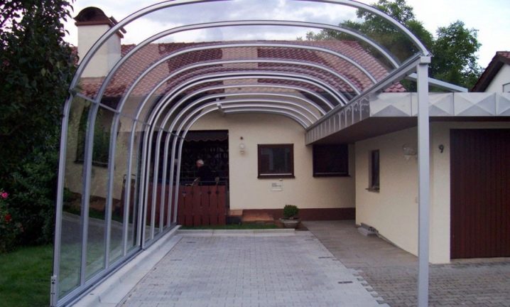 المادة الأكثر شيوعًا لبناء المظلات هي البولي كربونات. اعتمادًا على الأنواع ، فهي قادرة على نقل الضوء من 80 إلى 90٪. بعض منتجات البولي كربونات تحجب الأشعة فوق البنفسجية. نقترح أن تتعرف على رسومات المباني باستخدام هذه المواد: