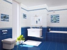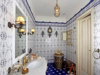 - Сините плочки на пода в банята се разреждат с малки декоративни елементи, за да съответстват на стените, а цокълът на тавана отразява цвета на пода..