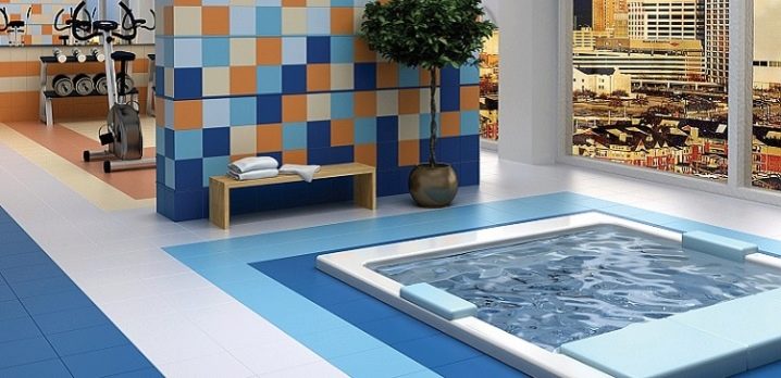 - Отделни зони са подчертани с цветни плочки на пода. Подът на басейна е декориран в блус и блус, а зоната за фитнес е декорирана в топли нюанси на жълто и оранжево. Тези цветове са свързани на стената, където резонират помежду си..