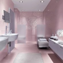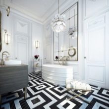 Ако изберете многоцветни плочки, тогава тук трябва да дадете предпочитание на прости модели под формата на малки ромби или въртящи се линии. И доста често с помощта на разноцветни плочки в класиката на пода се полага имитация на килим, около който се използват монохромни основни елементи.