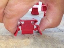 - В квадратния отвор се вмъква оребрен клин. Опитайте се да го направите плътно. Поради клина, който е визуално по -широк от стандартните пластмасови, се оказва, че се премахва разликата във височината между редица подредени фрагменти от плочки.