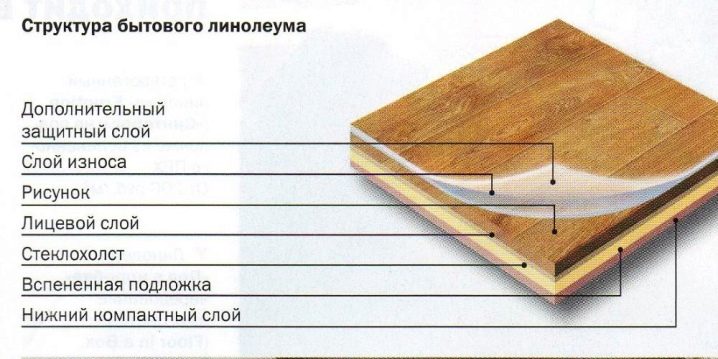 Дебелината на лист от домакински линолеум може да бъде до 5 мм. В повечето случаи се състои от 5 слоя. Основата му е предимно поливинилхлорид, който е основата. Също така за основата се използват юта, полиестер, филц..
