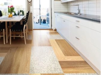 Когато избирате покритие за кухненски под, трябва да се съсредоточите върху размера на стаята. Ако е малък, по -добре е да изберете твърд и хомогенен материал.. Тя трябва да е устойчива на замърсявания, мазнини, течности. Добри възможности за работната зона са PVC, керамични материали. Можете да използвате и модерен синтетичен линолеум.