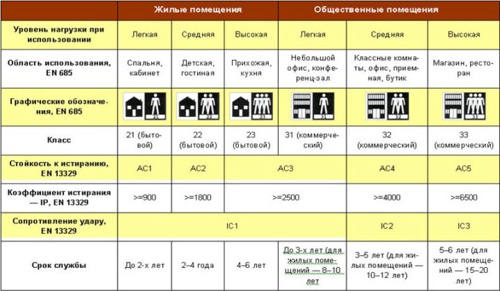 Например, ако опаковката е етикетирана с клас 21-23, тогава продуктът се използва само в домакинствата. Ако класът е 31-34, тогава инсталацията се извършва изключително на обществени места. Клас 41-43 се използва в промишлени помещения, в химически лаборатории, тъй като тези видове са устойчиви на химични реакции. Срокът на експлоатация на PVC покритие е много по -кратък от този на хомогенен материал, той е само 10 години.