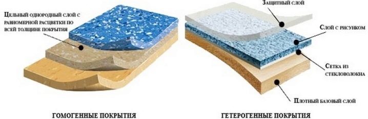 Хомогенните и хетерогенните линолеуми се различават по състав и технологични характеристики:
