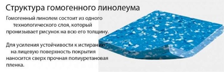 Предимствата на хомогенния линолеум включват преди всичко неговата висока якост, устойчивост на цвета е плътна и равномерно разпределена по целия слой. Тъй като продуктът съдържа промишлена вар, не се препоръчва да се допуска прекомерно замърсяване, това е изпълнено с дълбоко замърсяване на платното. Ще бъде възможно премахването на замърсяванията от повърхността само с помощта на шлифовъчна машина, последвано от нанасяне на специална мастика..