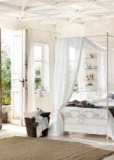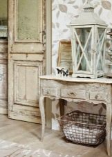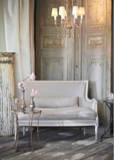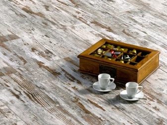 - Ламинатът под състарената паркетна дъска е любим на интериора в тенденциите на селски дизайн и стил shabby chic. В допълнение към създаването на автентична обстановка, изтърканото и нарязано покритие ще добави изразителност към обикновения декор на стаята..