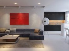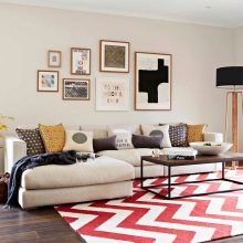 - Класическото разположение на килима под ъгловия диван. В тази стая изобщо няма ярки акценти, с изключение на малка осветена картина, така че закупуването на ярък шарен килим би било неуместно. Лек модел с ненатрапчив модел се вписва идеално в дизайна на стаята.