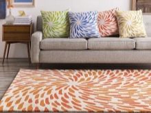 - Малък, но много ярък килим „изяжда“ зоната на стаята, привличайки вниманието към себе си. Отличен акцент дует на фотьойл и килим изглежда стилно и хармонично, останалите ярки детайли само го допълват. Свързващият елемент е възглавница, изработена от текстил с деликатни цветове.