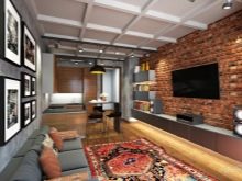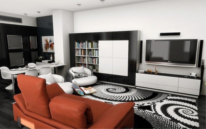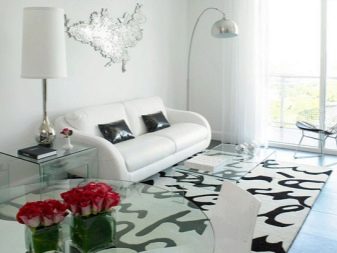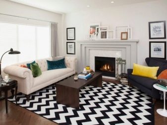 - Килим с орнамент изглежда интересен, ако е поставен пред дивана. Огледален градиентен модел визуално скрива зоната на стаята поради подреждането на черни елементи отстрани.