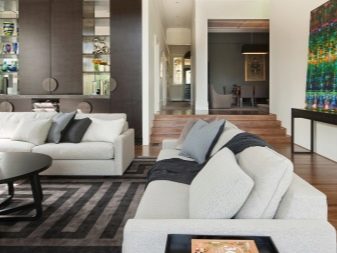 За да разделите визуално хола от няколко зони, за всяка зона можете да изберете свой собствен килим с различни текстури и цветове и да го подредите в зависимост от местоположението на основните мебели на определена зона, например на пода отпред на телевизора или диван за зона за отдих, под кресло за зона за четене, пред диван за зона за спане и т.н..