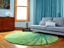 - Необичаен килим в еко-стил прилича на мъхеста поляна. Ето един добър пример, при който акцентът е върху цвета (различни нюанси на зелено), текстурата (различни дължини на купчината) и формата (вълнообразен ръб). Не си струва да използвате допълнителни декоративни елементи, съчетани с такъв килим, съществува голям риск от претоварване на стаята.