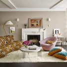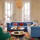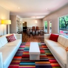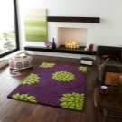 С живите, наситени цветове нещата са малко по -сложни. Когато избирате акцентен килим, трябва да се ръководите от цветното колело и да изберете нюанса на ярък елемент в рамките на два сектора от основния цвят. Например, червен килим ще подхожда както на червено-лилава стая, така и на жълто-оранжева..