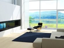 - Големият килим действа като акцентен детайл. Такива красиви елементи се нуждаят от правилното рамкиране, така че те трябва да се използват само в скромни монохромни интериори..