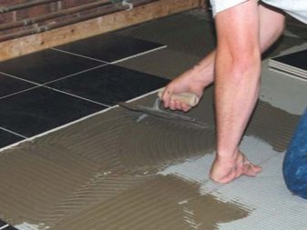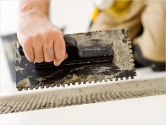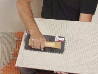При нанасяне на лепилото върху плочките трябва да се използва назъбена мистрия. Плочките се полагат според маркировките. С помощта на сградно ниво можете да следите равномерността на инсталацията, която се извършва. Получените несъответствия могат да бъдат коригирани с чук. Излишното лепило отстрани на плочката се отстранява.