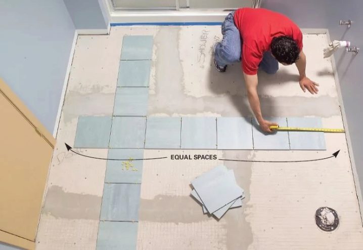 За да извършите работата по този начин, е необходимо да нанесете предварителни маркировки върху повърхността на пода. Първо, трябва да определите центъра на стаята по една от стените и да начертаете линия от този център до стената срещу нея. Същото се прави и на другите две останали страни на стените. В резултат на това трябва да получите две напречни линии с пресичане в центъра на тоалетната. Когато инсталирате първата плочка, трябва да започнете от тези редове..