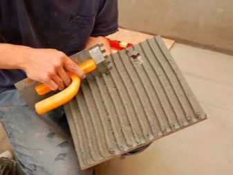Трябва да изрежете плочките с мелница. По време на такава работа очите трябва да бъдат защитени чрез носене на специални очила за това.. Между другото, не е нужно да режете плочките до дъното. Дискът на “мелницата” може да се задълбочи само с 2 мм. Плочката след такъв прорез ще се счупи по предвидената линия с лек натиск..