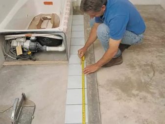За правилен монтаж началната точка ще бъде центърът на прага на тоалетната. За да го определите, триъгълна линийка се прилага към прага, върху замазката се прави маркировка с молив. След това трябва да вземете една плочка и да я нарежете наполовина, но не права, а диагонално.