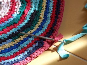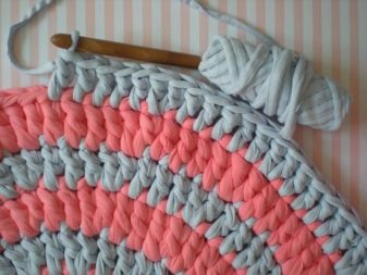 - Редувайки редовете по този начин, завържете с желания размер. Не забравяйте периодично да добавяте контури. Можете да използвате прежда от същия цвят, тогава килимът ви ще се окаже едноцветен или ще комбинира различни цветове, като ги редува.