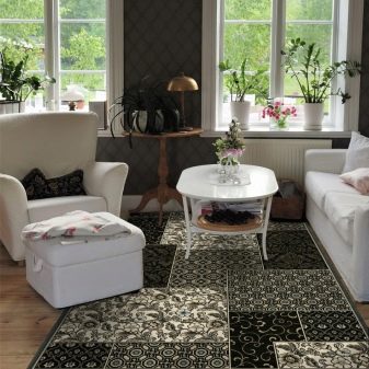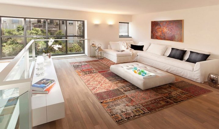 - Продуктите, направени по техниката на пачуърк, се вписват идеално в просторни помещения. Ако поставите такъв килим в средата на стаята, инсталирайки върху него малка масичка за кафе, допълнена с красиви мебели, получавате много уютен кът за сядане. Тази форма се комбинира с арки, еркери и усукани мебели. За да комбинирате зоните на помещението в едно цяло, покритието често се използва в тази конкретна техника, комбинирайки с негова помощ основните нюанси на двете стаи и ги прави по -хармонични..