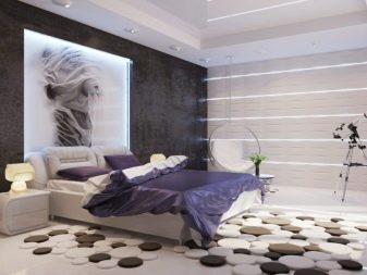 Ако харесвате ярки и оригинални дизайни, тогава можете да изберете асиметричен килим в интересни цветове. Такива опции са идеални както за спалня за възрастни, така и за детска стая..