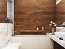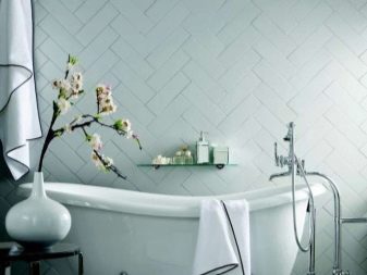Монтажът на стена е малко по-различен от този на пода. Оформлението с превръзка също прилича на тухла, поради което за нея се използват правоъгълни плочки. По този начин стените в банята често се подрязват. В този случай трябва да се използва комбинация от цветни и огледални скосени плочки. Този дизайн ще изглежда по -интересен..