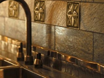 Месинговите плочки са много популярни за декорация на стени в по -сложен интериор. Като правило той има красив, грациозен декор с релефни шарки. Това могат да бъдат абстрактни изображения, монограми, стил империя. Популярни са модели с шарка под формата на слънце или с етнически печат. Тази плочка е скъпа, затова най -често се използва за акцентно или точково покритие. Обикновено има правилната форма..