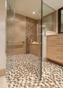 Според тази схема можете да направите мозайка на стената. Използването на едноцветни квадратчета с по-голям размер характеризира използването на техниката на пачуърк върху стената. Малките плочки са чудесни за облицовка в душ кабини с дренаж. С негова помощ можете да направите гладък наклон за източване на вода.