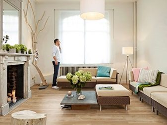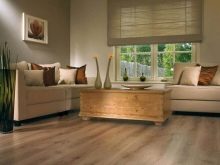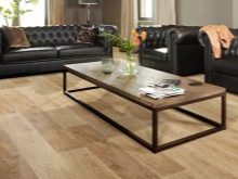 - Успешната комбинация от декоративни щори за прозорци, масичка за кафе и ламиниран паркет ще придаде на стаята специален стил и оригиналност. Повърхността изглежда безпроблемна и визуално разширява пространството.