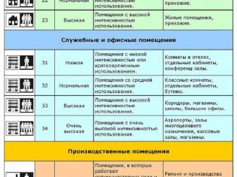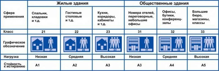 - Клас 33 (колекция King Size) може да се използва в танцови зали, хипермаркети. Производителят обещава дълъг експлоатационен живот (от 20 години), като същевременно поддържа външния вид.