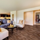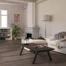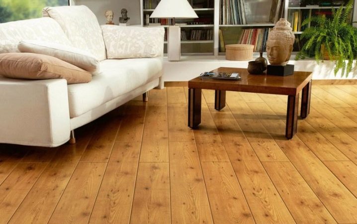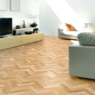 Разбира се, в хола шансовете за механично увреждане на подовата настилка са много по -малки, отколкото например в кухнята, тъй като в стаята няма остри или горещи предмети и не се използват агресивни почистващи препарати. Ето защо за залата можете да изберете не твърде скъпи видове продукти..