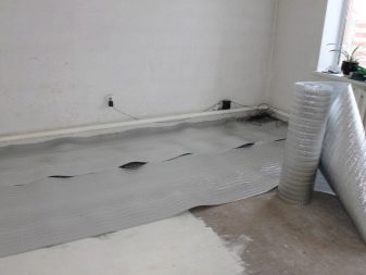 Ако ремонтът се извършва на първия етаж на жилищна сграда с неотопляема стая долу или в частна къща, тогава първоначално е необходимо да се погрижите за хидроизолацията. За да направите това, полиетиленът се разстила върху бетонната повърхност, а страните се фиксират с лента.