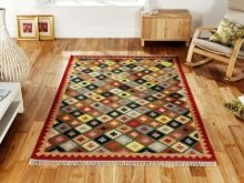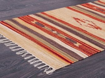- Без власинки. Този килим е направен от памучни конци чрез припокриване. Той има гладка пореста повърхност и е по -лесен за грижа от моделите с купчини. Едно от най -важните му предимства е по -ниската абсорбция. Прахът и мръсотията не се отлагат толкова силно върху такъв продукт. Килимът може да се пере дори в пералня при температура не повече от 40 градуса и да се изстиска на ръка. Ако имате нужда от най -обикновен килим, тогава обърнете внимание на тази опция..