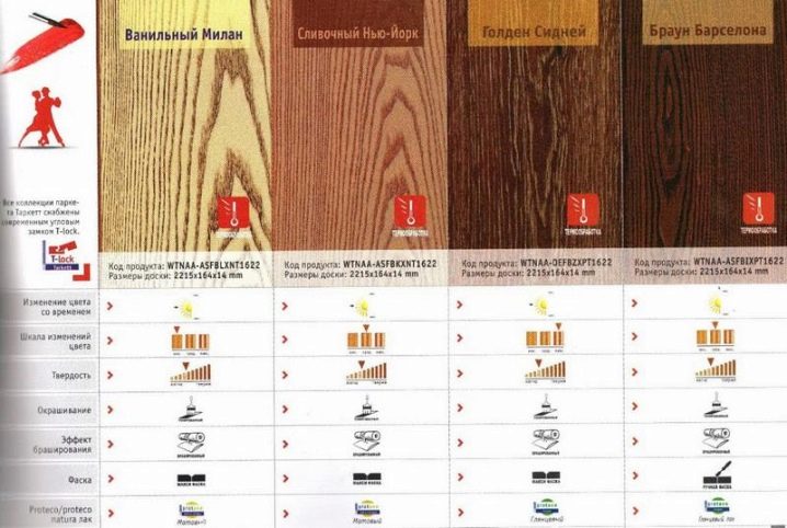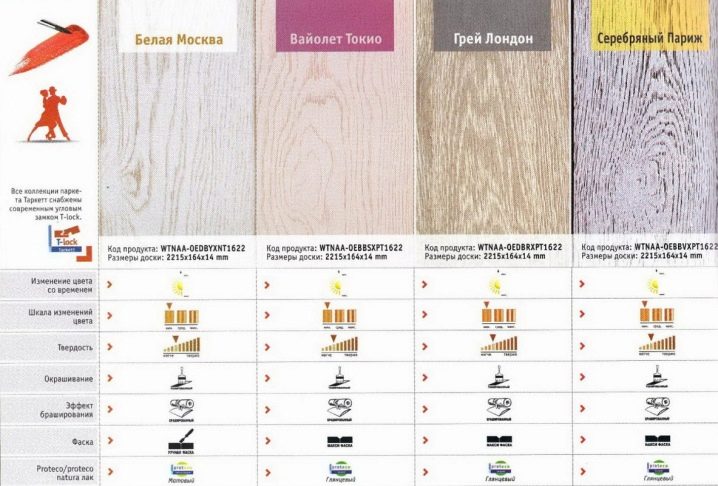 Всяка серия паркетни дъски има свои собствени технически характеристики (в допълнение към горните):