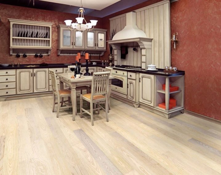 - Мода за изпълнение – ултрамодерна колекция с необичаен дизайн на дъски, базиран на цифров печат. Такова покритие е подходящо за доста просторни помещения, където по -голямата част от подовата повърхност е в постоянно зрително поле (зали, дневни). Паркетна дъска “Salvatore Style” от тази колекция е отлична основа за интериора на просторна кухня в селски стил.