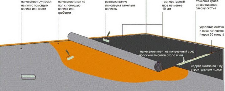 Линолеумът може да се монтира с лепило, без да се използва, или с двустранна лента. Изборът на лепило зависи от материала, който ще се монтира: