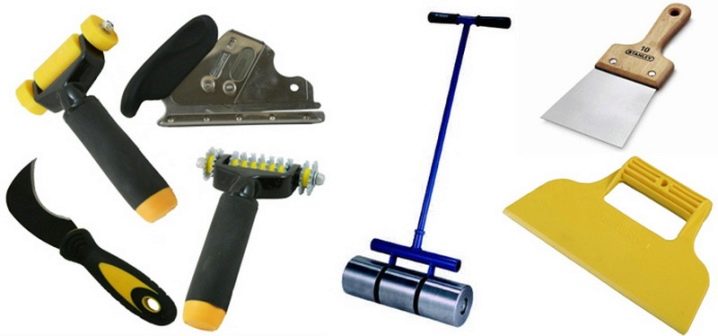 - Този тип линолеум се залепва по лентата и се търкаля със стоманена ролка, която тежи около 10 кг, което ви позволява равномерно разпределяне на лепилото, премахвайки въздуха от дъното.