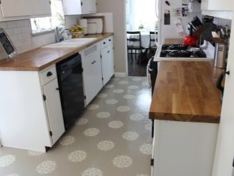 - За кухненски пространства идеалното решение е линолеум с имитация на мрамор, камък, дърво или гранит. Покритие с геометрични шарки, имитация на мозайки или керамика изглежда грандиозно.