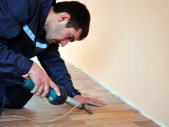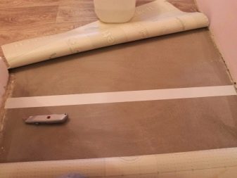 Въпреки че в помещения с малък кадри покритието не е залепено, тук може да се наложи да се фиксират фугите. Това става с двустранна лента. На един лист се изчертава надлъжна линия, която обозначава средата на лепящата лента. След като го залепите на правилното място, защитният слой се отстранява и се полагат две платна. Линолеумът ще се залепи за лентата, а лентата за пода и всички заедно ще осигурят фиксирането на покритието. Остава да инсталирате первазите и да забиете или да закрепите первазите към винтовете, като фиксирате линолеума на преходите към други помещения. Ако операцията не включва често пренареждане на мебели или оборудване, тогава фиксирането на первазите е напълно достатъчно. За други случаи има монтаж на лепило и допълнително фиксиране с первази..