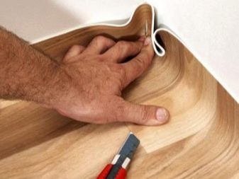 Регулирането се извършва, като се вземе предвид посоката на чертежа: линолеумът се полага с печат нагоре и се настройва спрямо характеристиките на пода, като се отрязват всички ненужни по периметъра с нож. Ако стените са равни, достатъчно е да оставите 0,5 см по краищата..