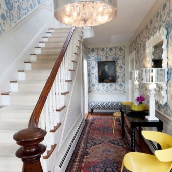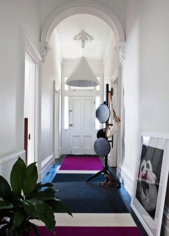 В този случай килимът е акцент за коридора. И е много компетентно, че акцентът тук е именно килимът, а не стените или каквито и да е мебели, които натоварват стените. Принтът визуално облекчава пространството, придава му лекота и, въпреки че не е най -заглушеният нюанс, интериорът веднага става оживен.