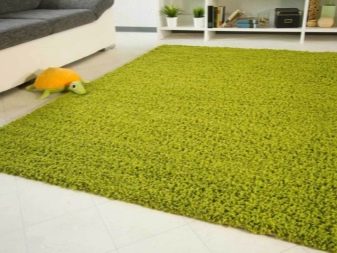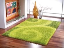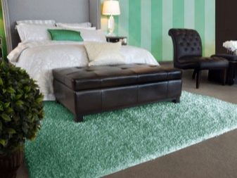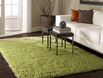 - светлозелен килим с дълга купчина може да добави бодрост и да добави разнообразие към строгите бежови и шоколадови цветове: такъв модел изважда всяко, дори и най -скучното преплитане на интериорни нюанси;