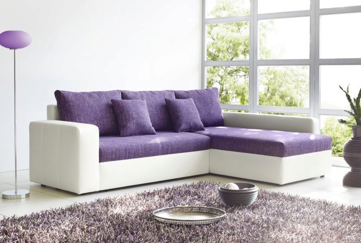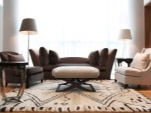 - модел с геометрични форми в лилави тонове се вписва идеално в дизайна на кафяво-бежова стая, ако поддържате сянката в тапицерията на мебелите (например фотьойл);