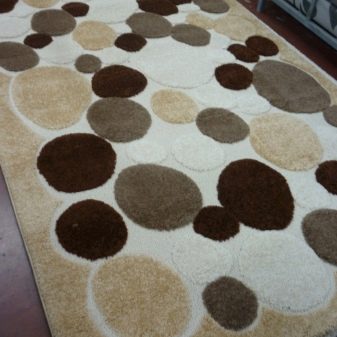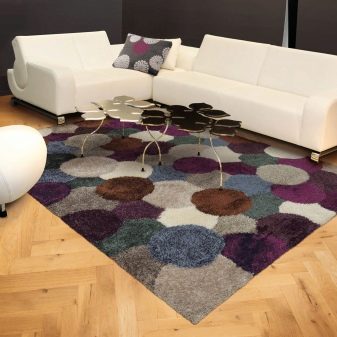 - килим, украсен с контрастни кръгове, може да бъде поставен в стая с тъмни стени: това ще поддържа цветовия баланс, но ще изисква разреждане на тоновете със светли цветове под формата на бели меки мебели и светъл ламинат;