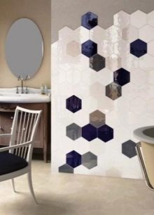 Декоративните модели са чудесни за хай-тек или минимализъм. Огледалните плочки под формата на пчелни пити също изглеждат страхотно в такива интериори. Привлича вниманието и ви позволява да запълните интериора със светлина, задайте модни акценти..