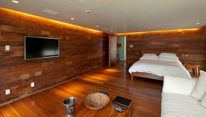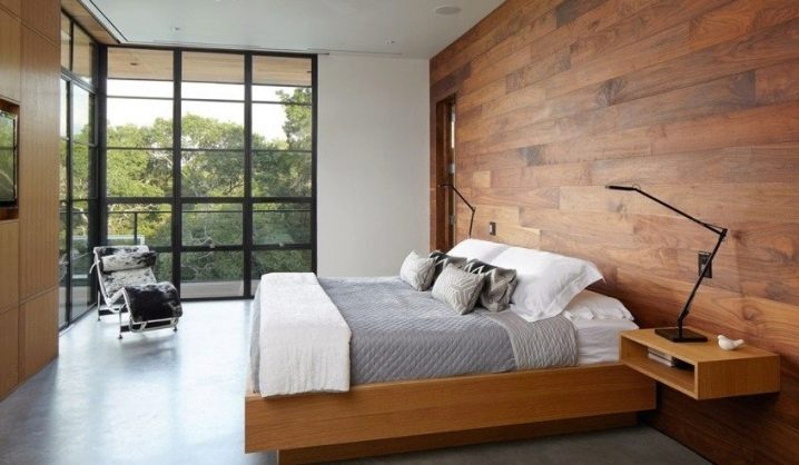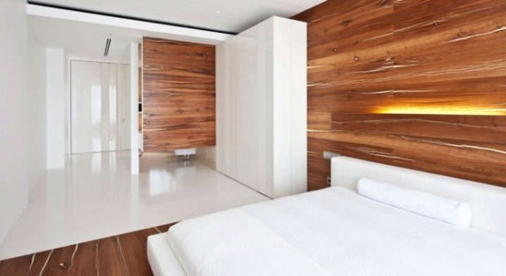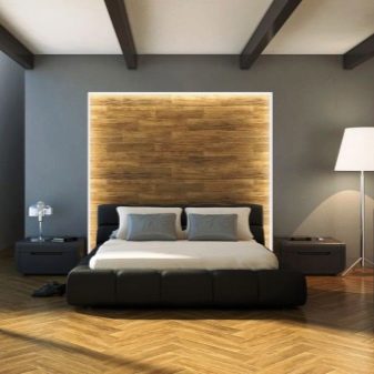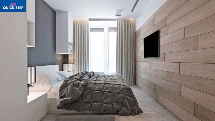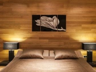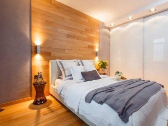 Възможно е да се монтират ламинирани панели като стенни покрития в почти всяка стая на апартамента. В спалнята традиционно се отличава част от стената в главата на леглото. Топлият дървен ламинат ще създаде уют и хармония в стаята. Облицованите ламинирани стени в спалнята могат да бъдат допълнително изолирани от шум с помощта на обвивката. Също така е лесно да скриете проводници и контакти от лампи в тях..